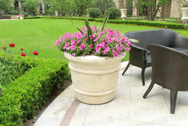 石材花缽的造型已經(jīng)打破了傳統(tǒng)的口大底小的倒圓臺(tái)或者倒棱臺(tái)形狀,造型奇特,不僅僅只是一個(gè)花缽,更是兼?zhèn)淞擞^賞藝術(shù)的功能。用一整塊石頭采用傳統(tǒng)工藝雕琢而成,其文化味也是十足的。加上花卉的點(diǎn)綴,便有一種孤芳自賞的美感自然流出。