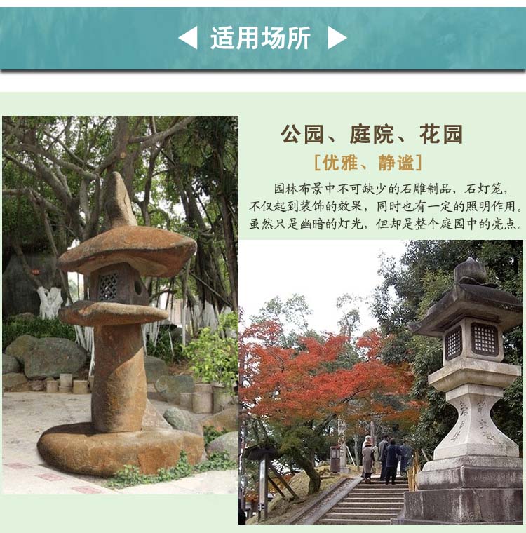 石燈籠是日本石文化的重要內(nèi)容之一,也是近年來我國出口日本石制品的一個重要品種。石燈籠在日本有著非常悠久的歷史。在佛前獻燈火是佛教的重要禮儀之一,自奈良時代 (公元 710~ 794年 )起日本在修建寺院時就開始在寺院的正面建造石燈籠以保護向寺院所獻的燈火。日本現(xiàn)存的最古老的石燈籠是奈良時代的當(dāng)麻寺石燈籠,距今已有一千多年的歷史了。到了江戶時代 (公元 1603~ 1867年 )石燈籠在日本已廣為流傳,一些寺院里造型精美的石燈籠被作為樣本模仿雕刻以至形成了石燈籠的各種形式。石燈籠被用于園林、庭院的裝飾始于十六世紀晚期的安土桃山時代,當(dāng)時由于茶道的大發(fā)展,石燈籠常被作為茶室的一種露天裝飾物而廣泛進入庭院裝飾。隨著石燈籠用途的改變,石燈籠的樣式也就更加多樣化了,例如出現(xiàn)了三腳或四腳的雪見燈籠,同時對竿和笠的部分也給予新的設(shè)計,石燈籠的式樣由模仿進入創(chuàng)新?,F(xiàn)在日本的石燈籠除了少量用于寺院神社以外,大多數(shù)的石燈籠是用于庭院、園林裝飾使用。