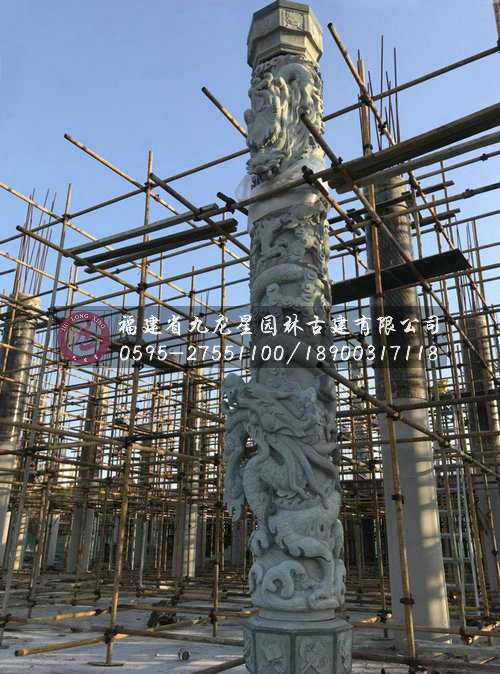 龍柱就是柱子上雕有蟠龍,雕龍柱大多采用浮雕,蟠龍的形象比較突出,而其中最為精彩的是高浮雕手法雕制而成的龍柱,龍紋更具立體感,更為生動。九龍星園林古建雕刻的龍柱龍形生動如生,雕刻技藝精湛。