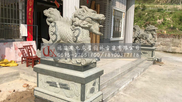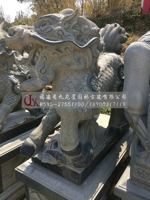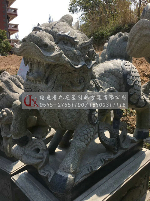 麒麟造型中石刻麒麟多在建筑、皇家建筑里出現(xiàn),其體型巨大,多以威武雄健之態(tài)出現(xiàn)。這說明,麒麟造型的比例尺寸大小是與特定的環(huán)境、風(fēng)俗、情感相聯(lián)系的。石雕麒麟的大也可以解釋為大氣、圣威、權(quán)利,具有震懾的作用。石雕麒麟的造型遵循著傳統(tǒng)文化審美的習(xí)慣,麒麟的造型特征說明其造物意象充滿了對美好與吉祥的期望。石雕麒麟的整個造型集龍頭、鹿角、獅眼、虎背、熊腰、蛇鱗、馬蹄、豬尾于一身,另外使用添加手法在下頜處加有長長的胡須,又添加翅膀,這樣,麒麟可以奔跑,可以飛翔,威武之勢讓人可望不可及。麒麟體現(xiàn)了古人對現(xiàn)實世界的主觀理想與造物的主動性,其和龍、鳳一樣成了我國傳統(tǒng)民族精神的象征。還有,石雕麒麟的擺放一般是成雙成對出現(xiàn)的,主要因為其造型講究碩大豐滿,還注重陰陽相守,忌諱殘缺不全、形單影只,其中寄托了人們“天人和諧”的精神追求,內(nèi)涵獨特而豐富。
