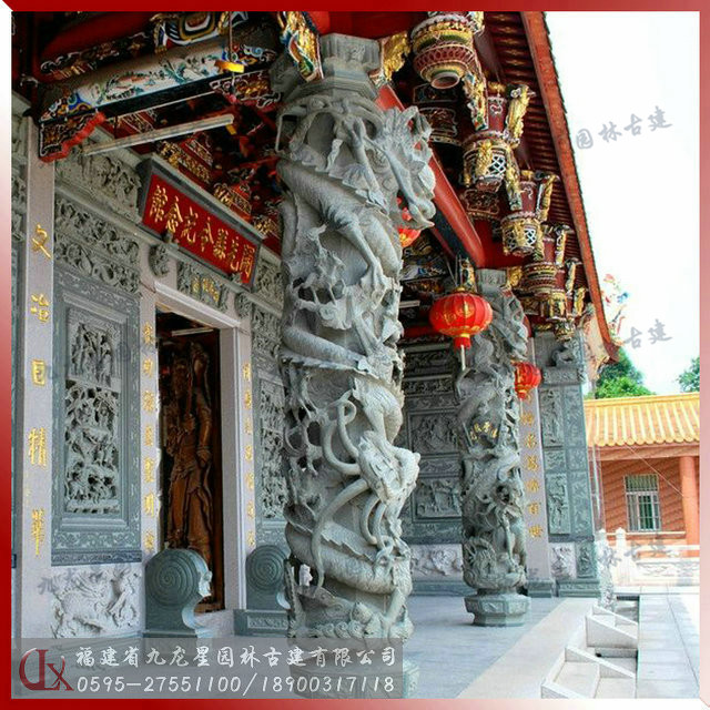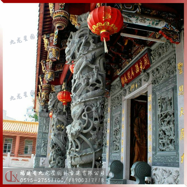 寺廟石雕龍柱是一種龍形浮雕圓柱,通身塑有纏柱云龍,栩栩如生,立在廣場(chǎng)路邊成為景觀和地標(biāo)。在我們福建閩南沿海地區(qū)幾乎逢廟必有龍柱,讓人可以從龍的軀體雕鑿中感受到古代藝匠想要極力表達(dá)的“龍行虎步”、“龍虎精神”的意念。龍柱是中華民族的傳統(tǒng)建筑物,有著悠久的歷史。