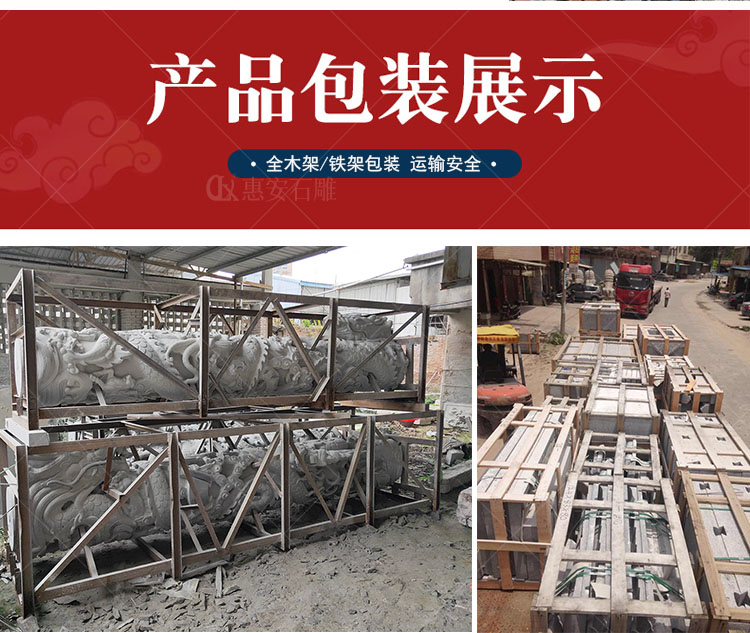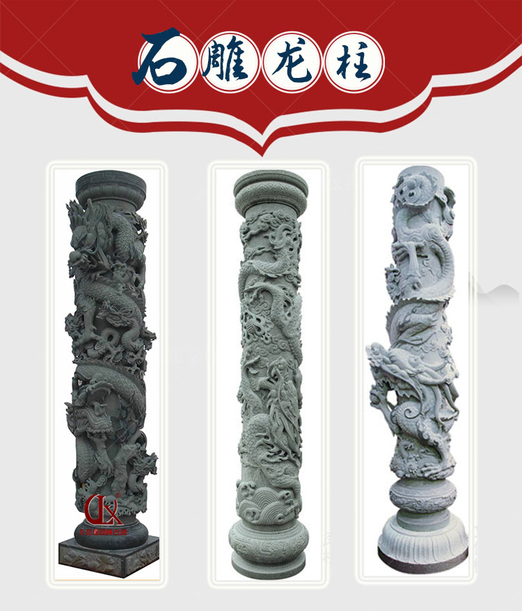 福建廠石雕龍柱產(chǎn)品構(gòu)成為柱礎(chǔ)、柱身、柱頭(柱帽)三部分,龍柱一般為圓柱形,通身雕刻有纏柱云龍,適用于宮觀寺院、宗祠古厝、園林景觀、廣場(chǎng)擺件等,常用石料為花崗巖與青石。
